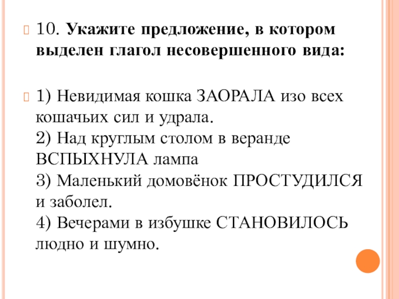 10. Укажите предложение, в котором выделен глагол несовершенного вида: 1) Невидимая кошка ЗАОРАЛА изо всех кошачьих сил