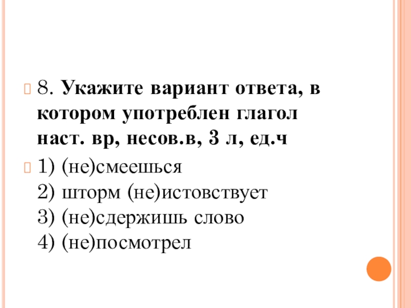 8. Укажите вариант ответа, в котором употреблен глагол наст. вр, несов.в, 3 л, ед.ч1) (не)смеешься  2)
