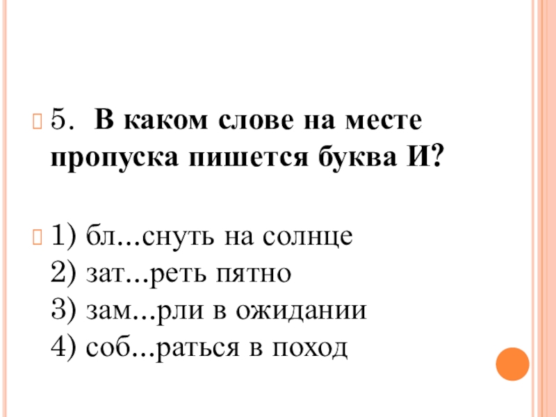 5.  В каком слове на месте пропуска пишется буква И? 1) бл...снуть на солнце 2) зат...реть пятно