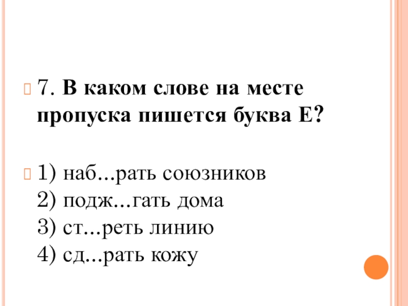 7. В каком слове на месте пропуска пишется буква Е? 1) наб...рать союзников 2) подж...гать дома 3)