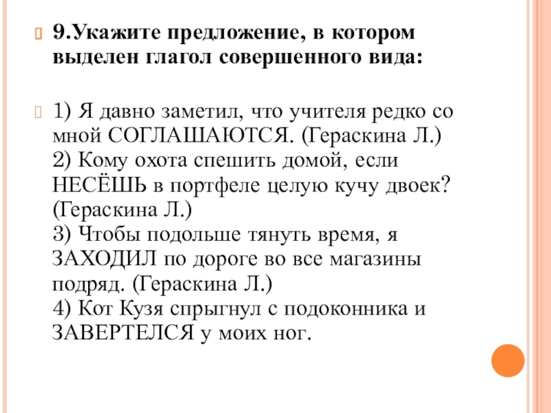 9.Укажите предложение, в котором выделен глагол совершенного вида: 1) Я давно заметил, что учителя редко со мной