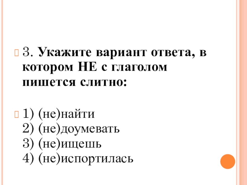 3. Укажите вариант ответа, в котором НЕ с глаголом пишется слитно: 1) (не)найти 2) (не)доумевать 3) (не)ищешь