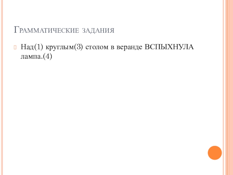 Грамматические задания Над(1) круглым(3) столом в веранде ВСПЫХНУЛА лампа.(4)