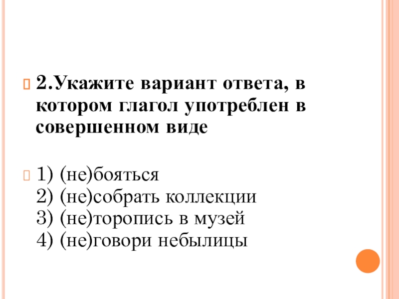 2.Укажите вариант ответа, в котором глагол употреблен в совершенном виде 1) (не)бояться 2) (не)собрать коллекции 3) (не)торопись