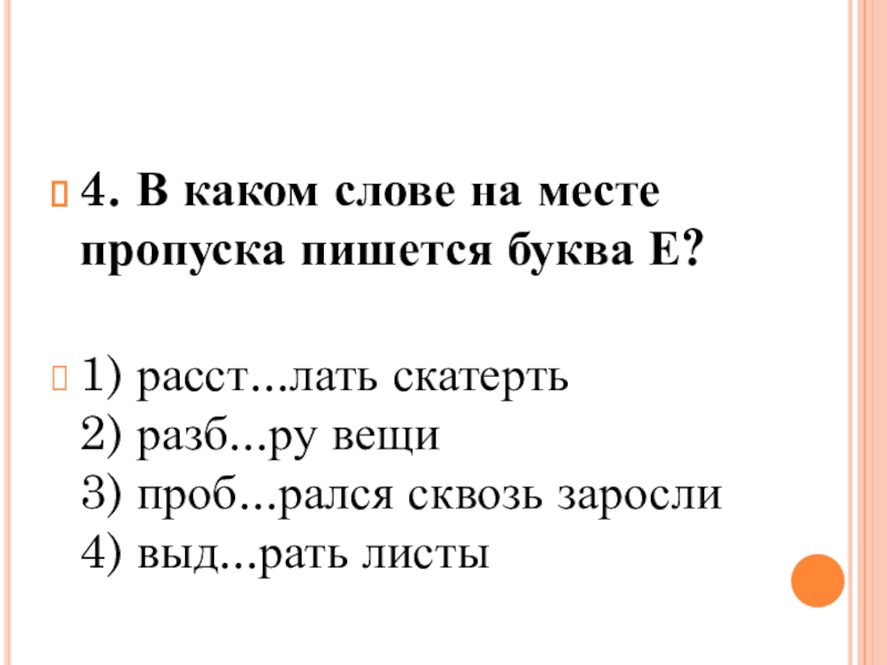 4. В каком слове на месте пропуска пишется буква Е? 1) расст...лать скатерть 2) разб...ру вещи 3) проб...рался