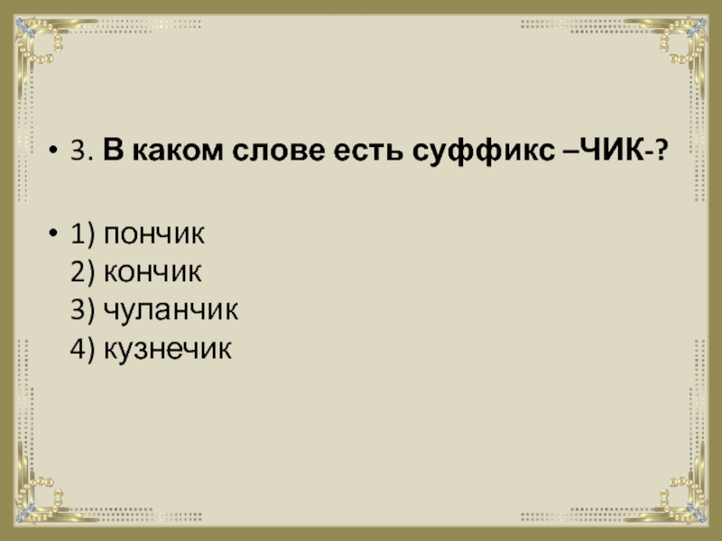 3. В каком слове есть суффикс –ЧИК-? 1) пончик 2) кончик 3) чуланчик 4) кузнечик