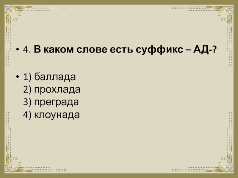 4. В каком слове есть суффикс – АД-? 1) баллада 2) прохлада 3) преграда 4) клоунада