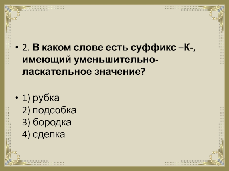 2. В каком слове есть суффикс –К-, имеющий уменьшительно-ласкательное значение? 1) рубка 2) подсобка 3) бородка 4)