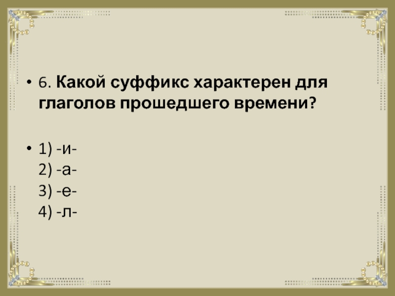 6. Какой суффикс характерен для глаголов прошедшего времени? 1) -и- 2) -а- 3) -е- 4) -л-