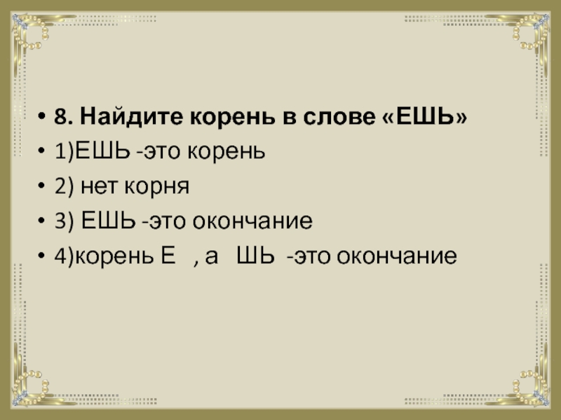 8. Найдите корень в слове «ЕШЬ»1)ЕШЬ -это корень2) нет корня3) ЕШЬ -это окончание4)корень Е  , а