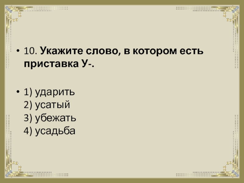 10. Укажите слово, в котором есть приставка У-. 1) ударить 2) усатый 3) убежать 4) усадьба