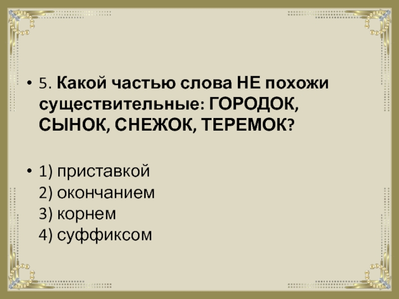 5. Какой частью слова НЕ похожи существительные: ГОРОДОК, СЫНОК, СНЕЖОК, ТЕРЕМОК? 1) приставкой 2) окончанием 3) корнем