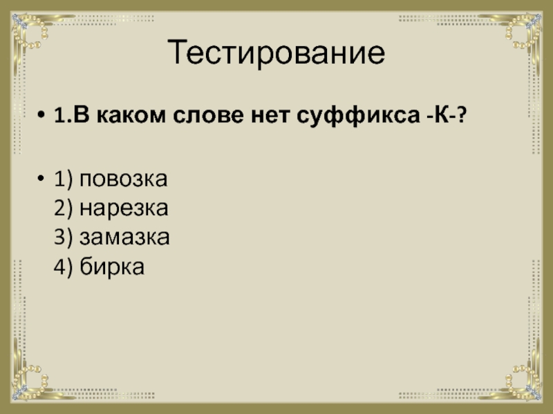 Тестирование1.В каком слове нет суффикса -К-? 1) повозка 2) нарезка 3) замазка 4) бирка