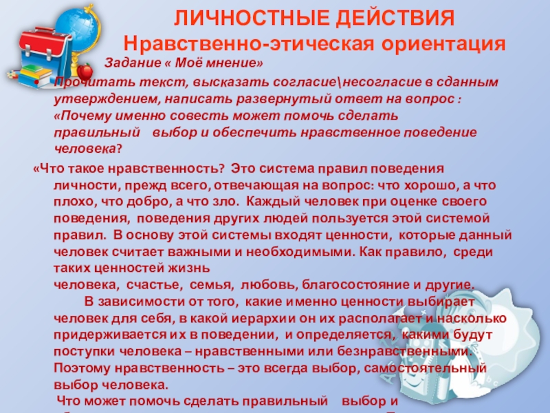 Прочитать текст, высказать согласие\несогласие в сданным утверждением, написать развернутый ответ на вопрос : «Почему именно совесть может помочь сделать правильный выбор и обеспечить нравственное поведение человека?