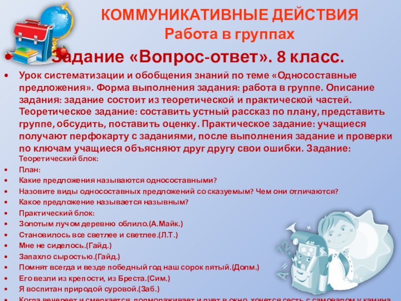 и обобщения знаний по теме «Односоставные предложения». Форма выполнения задания: работа в группе. Описание задания: задание состоит из теоретической и практической частей. Теоретическое задание: составить устный рассказ по плану, представить группе, обсудить, поставить оценку. Практическое задание: учащиеся получают перфокарту с заданиями, после выполнения задание и проверки по ключам учащиеся объясняют друг другу свои ошибки. Задание: Теоретический блок: