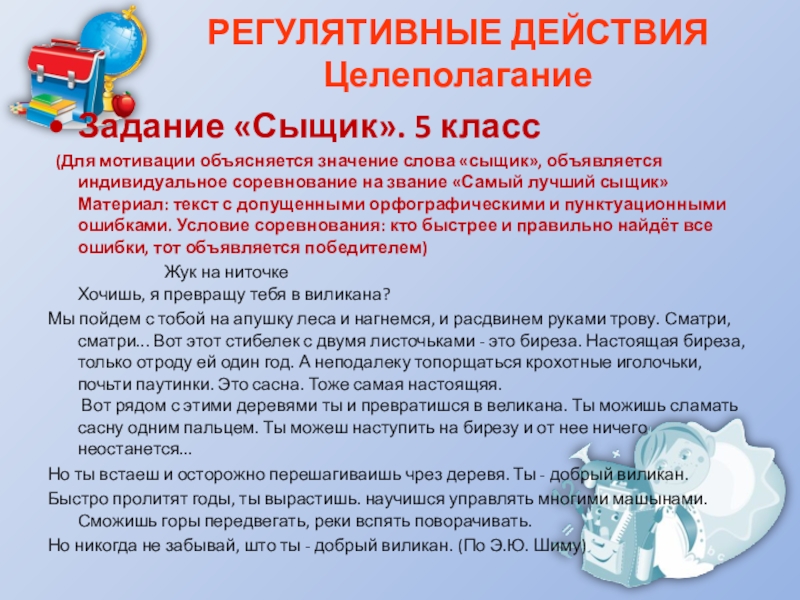 слова «сыщик», объявляется индивидуальное соревнование на звание «Самый лучший сыщик» Материал: текст с допущенными орфографическими и пунктуационными ошибками. Условие соревнования: кто быстрее и правильно найдёт все ошибки, тот объявляется победителем)