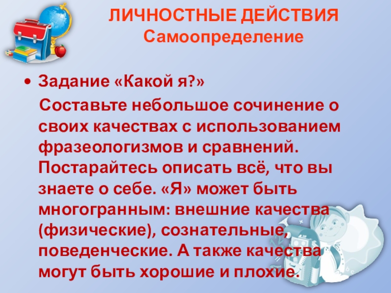 своих качествах с использованием фразеологизмов и сравнений. Постарайтесь описать всё, что вы знаете о себе. «Я» может быть многогранным: внешние качества (физические), сознательные, поведенческие. А также качества могут быть хорошие и плохие.