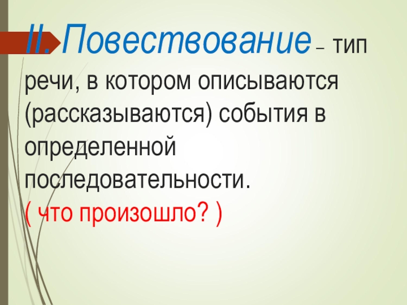 Слайд 6II. Повествование – тип речи, в котором описываются (рассказываются) события в