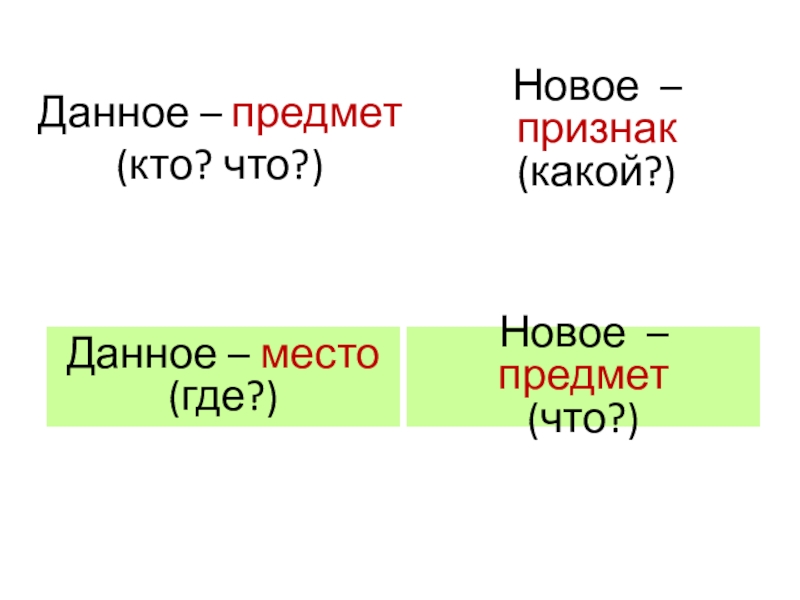 Данное – предмет (кто? что?)Новое – признак (какой?)Данное – место (где?)Новое – предмет(что?)