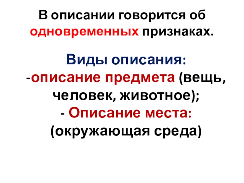 В описании говорится об одновременных признаках.Виды описания:-описание предмета (вещь, человек, животное);- Описание места: (окружающая среда)