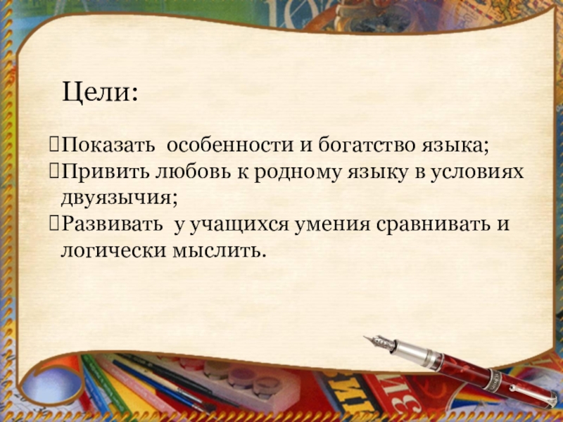 Цели: Показать особенности и богатство языка;Привить любовь к родному языку в условиях двуязычия;Развивать у учащихся умения сравнивать