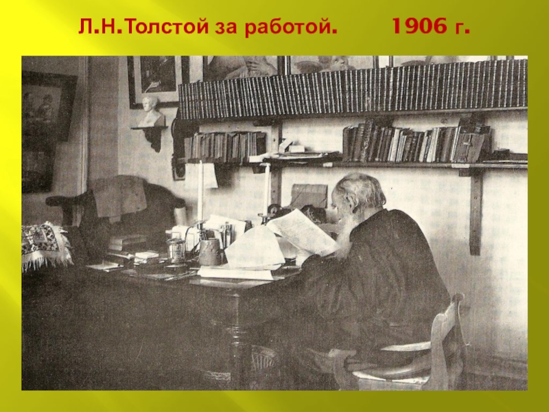 Слайд 34Л.Н.Толстой в кабинете за работой 1909 г. Ясная Поляна