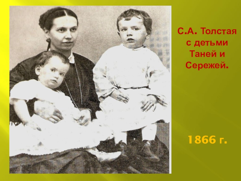 Слайд 7С.А. Толстая с детьми Таней и Сережей. 1866 г.