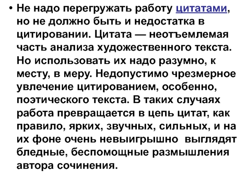 в цитировании. Цитата — неотъемлемая часть анализа художественного текста. Но использовать их надо разумно, к месту, в меру. Недопустимо чрезмерное увлечение цитированием, особенно, поэтического текста. В таких случаях работа превращается в цепь цитат, как правило, ярких, звучных, сильных, и на их фоне очень невыигрышно выглядят бледные, беспомощные размышления автора сочинения.