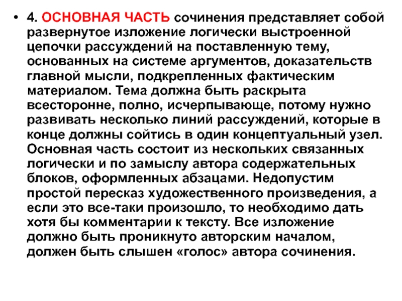 рассуждений на поставленную тему, основанных на системе аргументов, доказательств главной мысли, подкрепленных фактическим материалом. Тема должна быть раскрыта всесторонне, полно, исчерпывающе, потому нужно развивать несколько линий рассуждений, которые в конце должны сойтись в один концептуальный узел. Основная часть состоит из нескольких связанных логически и по замыслу автора содержательных блоков, оформленных абзацами. Недопустим простой пересказ художественного произведения, а если это все-таки произошло, то необходимо дать хотя бы комментарии к тексту. Все изложение должно быть проникнуто авторским началом, должен быть слышен «голос» автора сочинения.