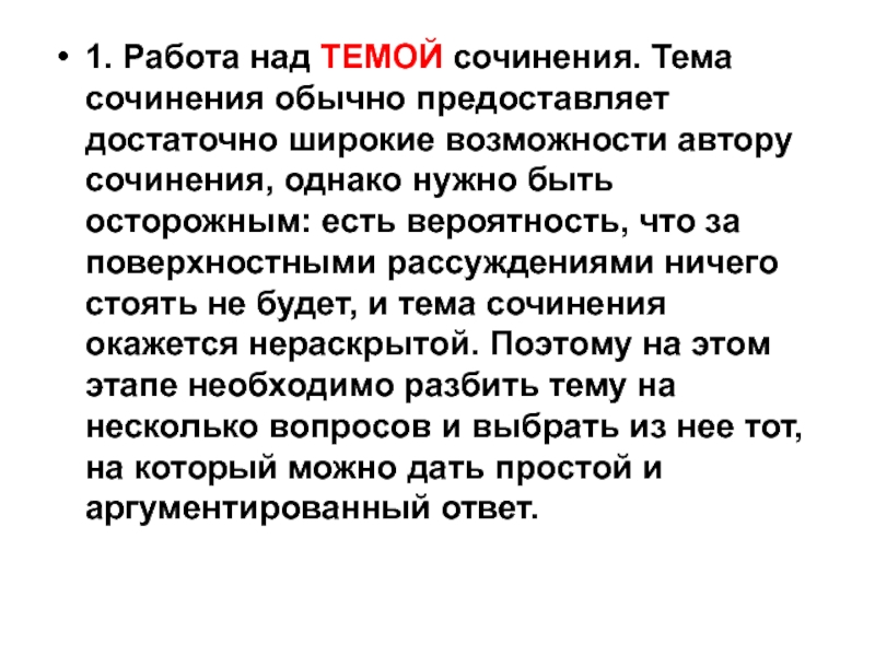 возможности автору сочинения, однако нужно быть осторожным: есть вероятность, что за поверхностными рассуждениями ничего стоять не будет, и тема сочинения окажется нераскрытой. Поэтому на этом этапе необходимо разбить тему на несколько вопросов и выбрать из нее тот, на который можно дать простой и аргументированный ответ.