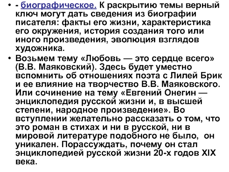 Возьмем тему «Любовь — это сердце всего» (В.В. Маяковский). Здесь будет уместно вспомнить об отношениях поэта с Лилей Брик и ее влияние на творчество В.В. Маяковского. Или сочинение на тему «Евгений Онегин — энциклопедия русской жизни и, в высшей степени, народное произведение». Во вступлении желательно рассказать о том, что это роман в стихах и ни в русской, ни в мировой литературе подобного не было, он уникален. Порассуждать, почему он стал энциклопедией русской жизни 20-х годов XIX века.