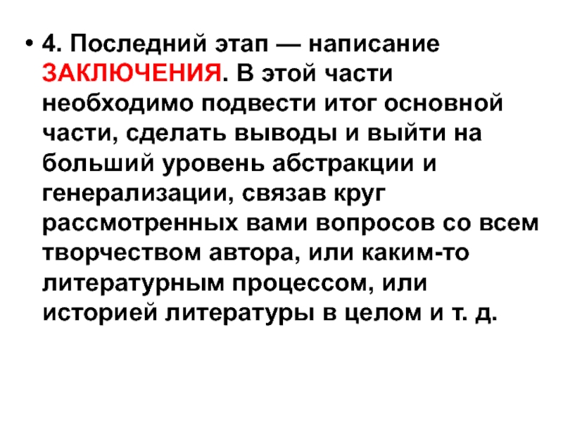 Слайд 214. Последний этап — написание ЗАКЛЮЧЕНИЯ. В этой части необходимо подвести