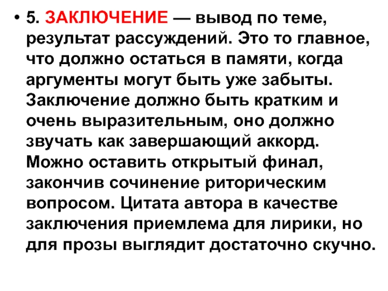что должно остаться в памяти, когда аргументы могут быть уже забыты. Заключение должно быть кратким и очень выразительным, оно должно звучать как завершающий аккорд. Можно оставить открытый финал, закончив сочинение риторическим вопросом. Цитата автора в качестве заключения приемлема для лирики, но для прозы выглядит достаточно скучно.