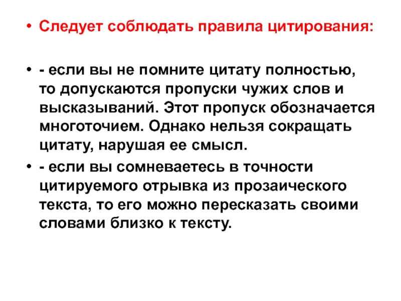 - если вы сомневаетесь в точности цитируемого отрывка из прозаического текста, то его можно пересказать своими словами близко к тексту.