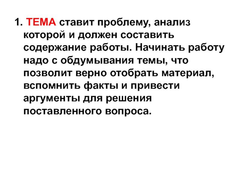 Начинать работу надо с обдумывания темы, что позволит верно отобрать материал, вспомнить факты и привести аргументы для решения поставленного вопроса.