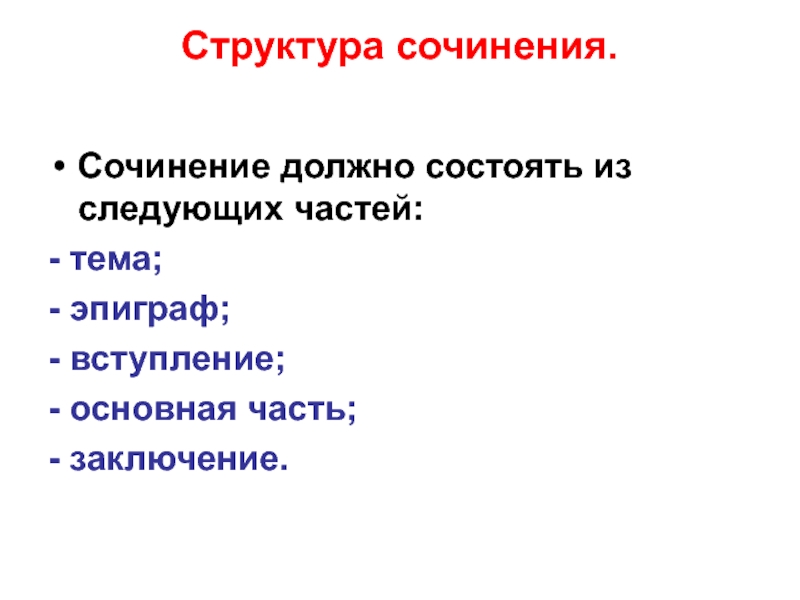 Вступление и заключение вместе должны составлять не более 1/4 части всей работы, главная же часть — охватывать 3/4 сочинения. Не следует загромождать сочинение незначительными фактами, второстепенными деталями, сопутствующими размышлениями.