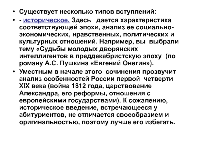 Уместным в начале этого сочинения прозвучит анализ особенностей России первой четверти XIX века (война 1812 года, царствование Александра, его реформы, отношения с европейскими государствами). К сожалению, историческое введение, встречающееся у абитуриентов, не отличается своеобразием и оригинальностью, поэтому лучше его избегать.