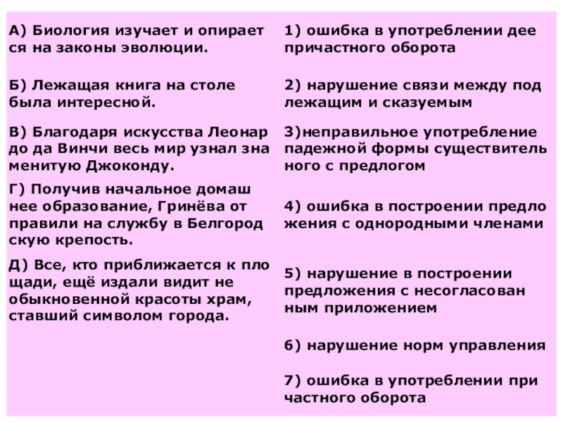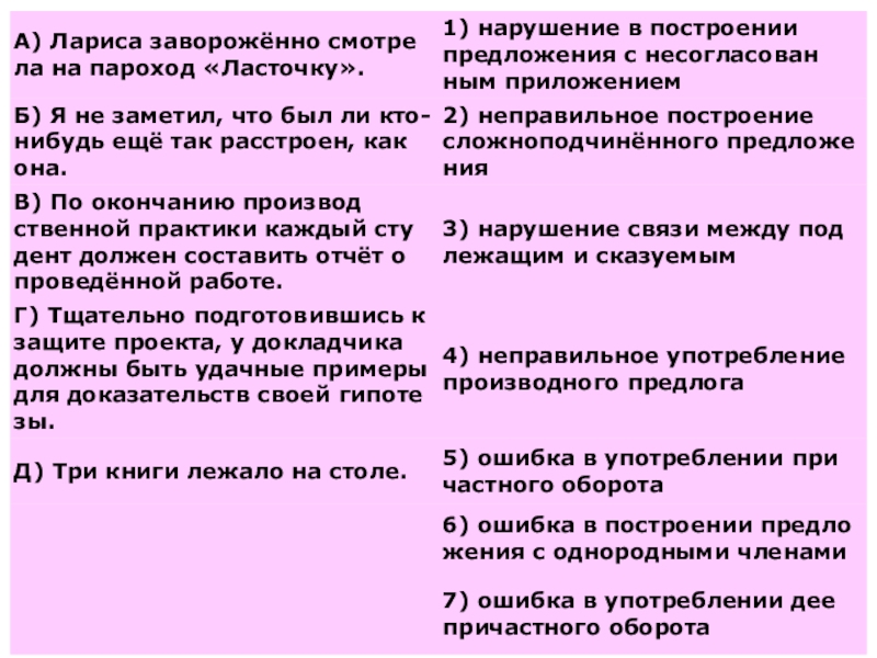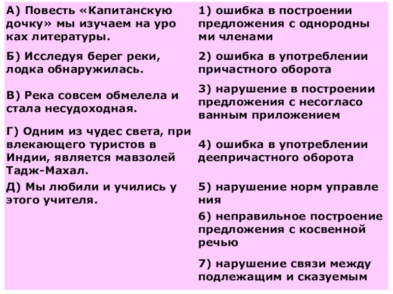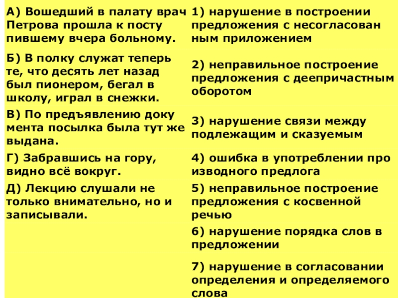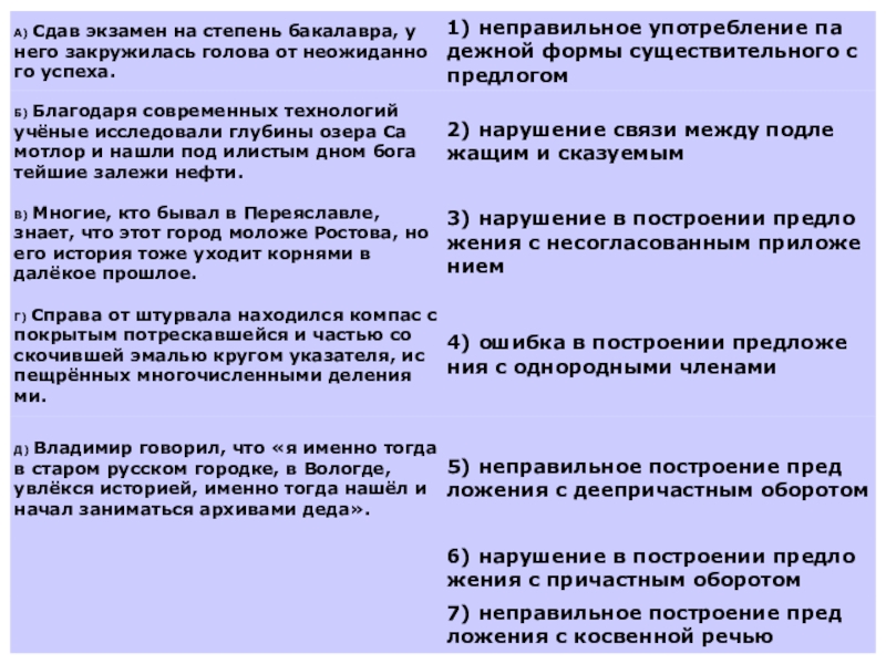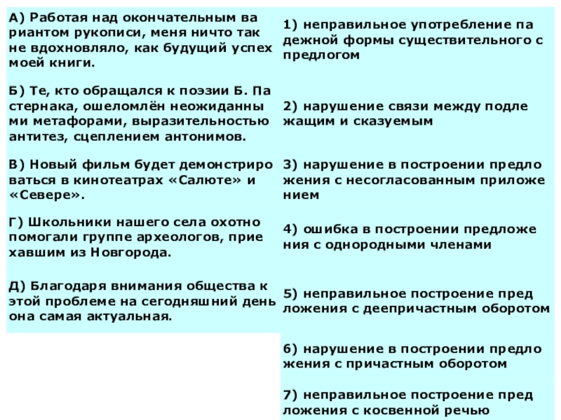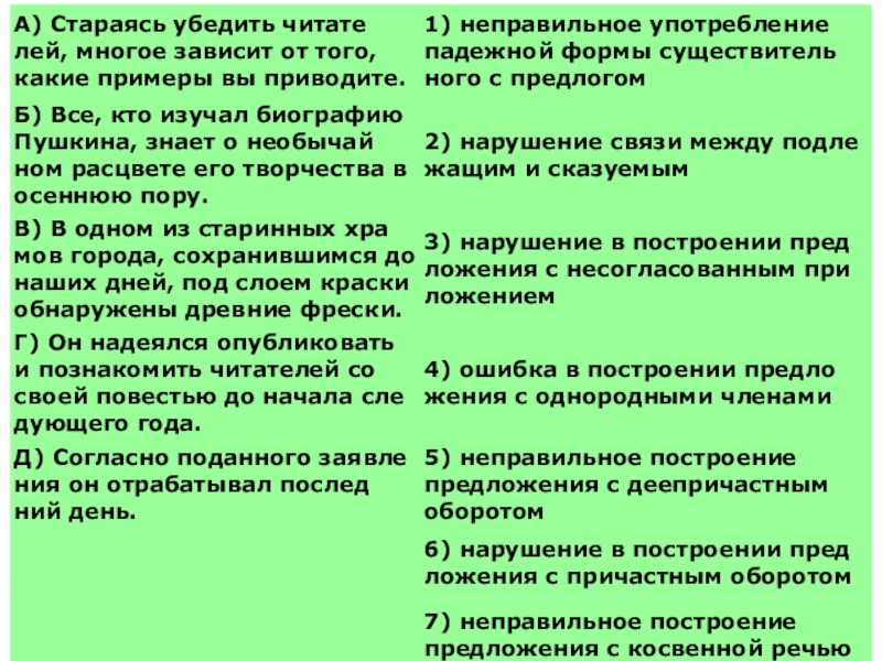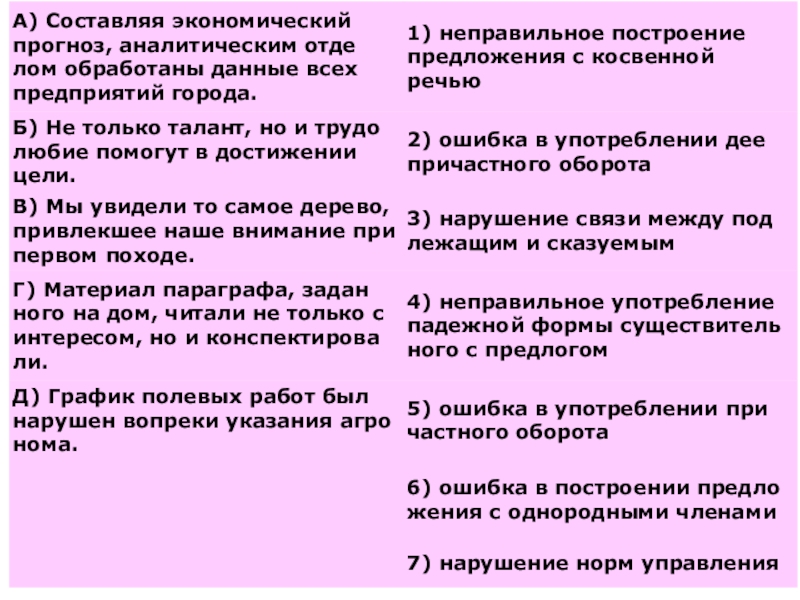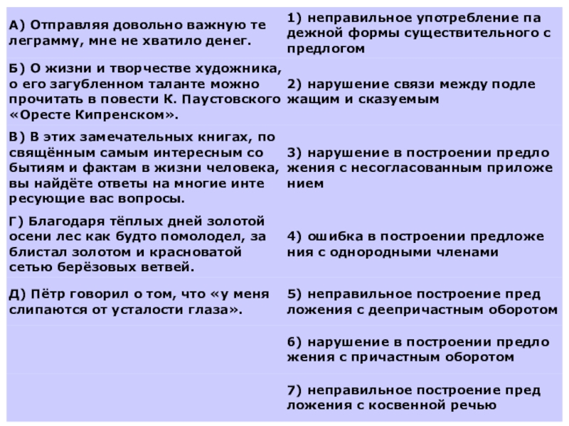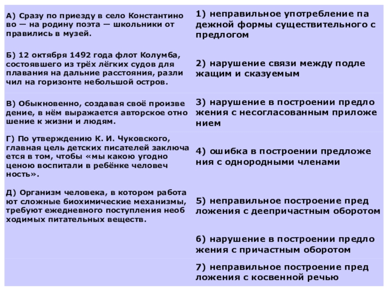 За­да­ние 7 № 8210. Уста­но­ви­те со­от­вет­ствие между пред­ло­же­ни­я­ми и до­пу­щен­ны­ми и них грам­ма­ти­че­ски­ми ошиб­ка­ми: к каж­дой по­зи­ции пер­во­го столб­ца под­бе­ри­те со­от­вет­ству­ю­щую по­зи­цию из вто­ро­го столб­ца.