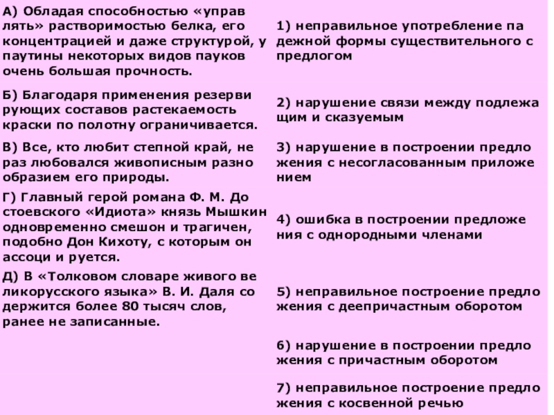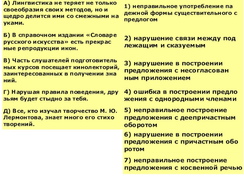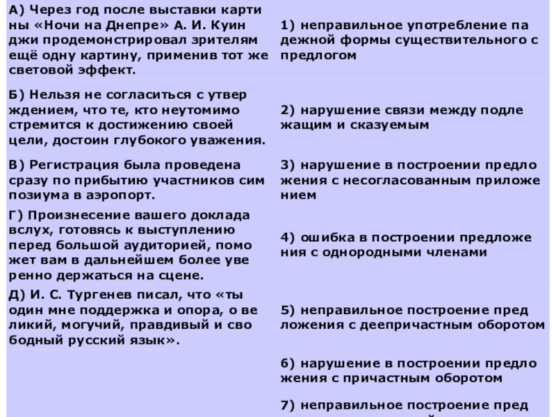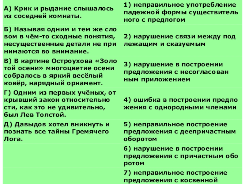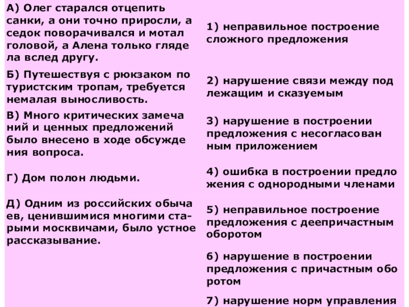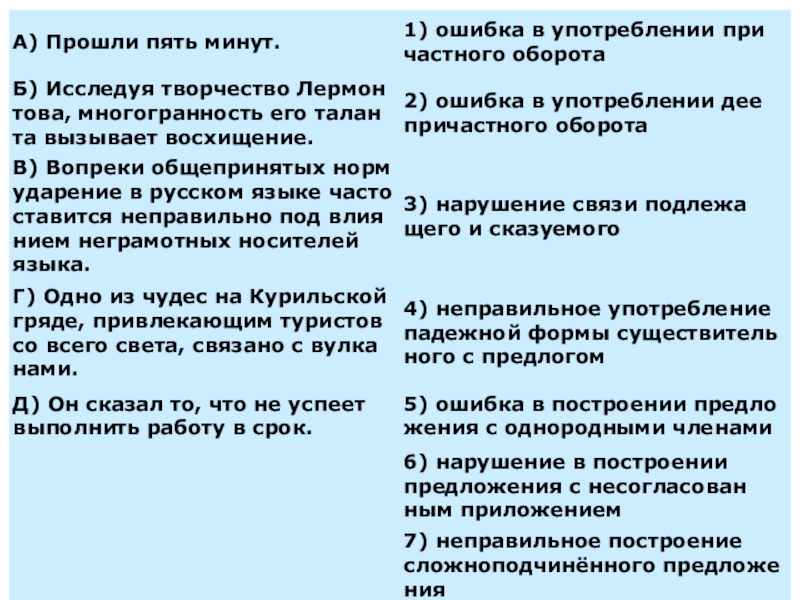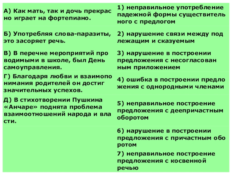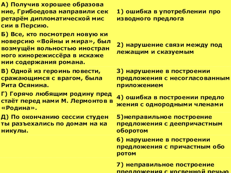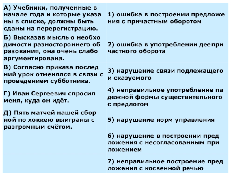 За­да­ние 7 № 8210. Уста­но­ви­те со­от­вет­ствие между пред­ло­же­ни­я­ми и до­пу­щен­ны­ми и них грам­ма­ти­че­ски­ми ошиб­ка­ми: к каж­дой по­зи­ции пер­во­го столб­ца под­бе­ри­те со­от­вет­ству­ю­щую по­зи­цию из вто­ро­го столб­ца.