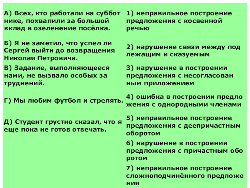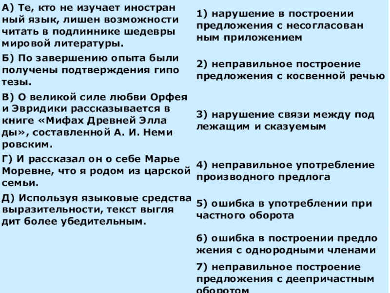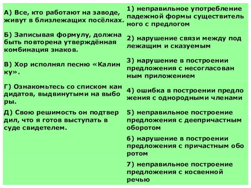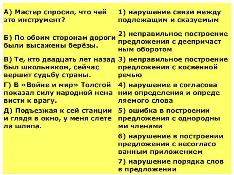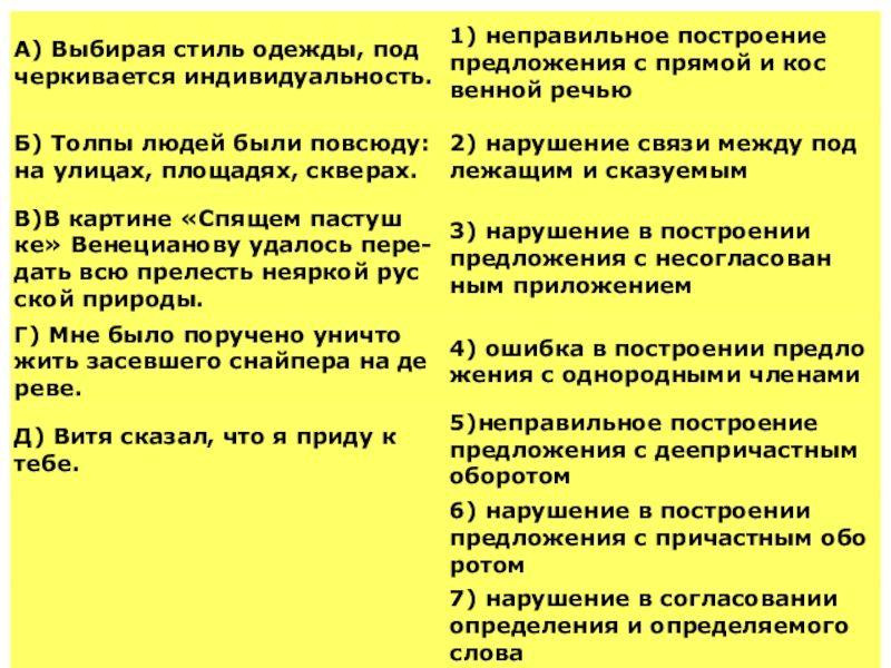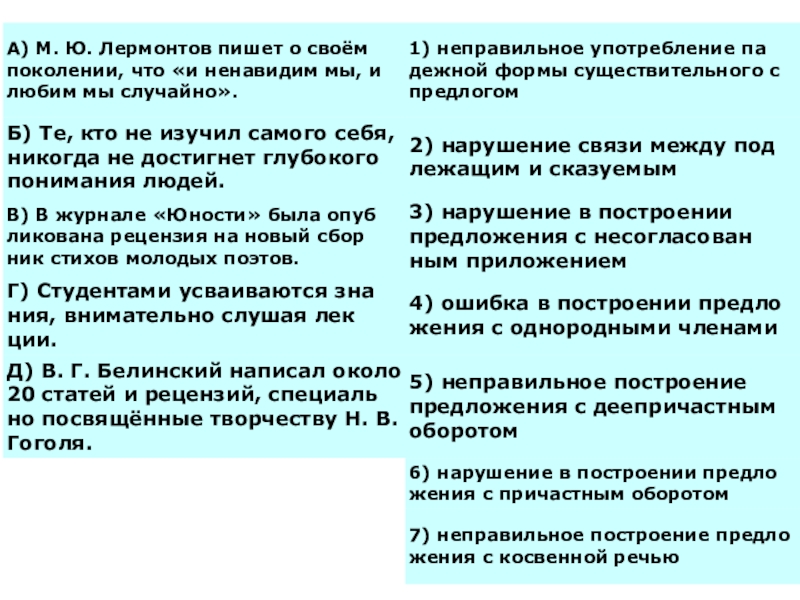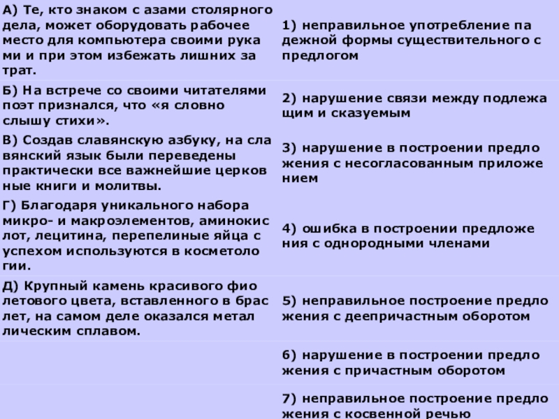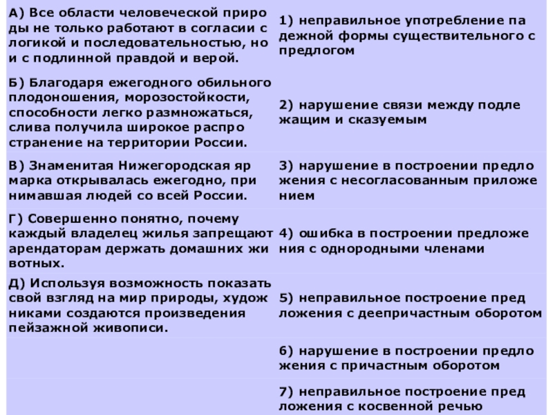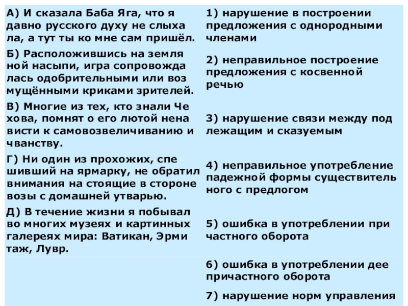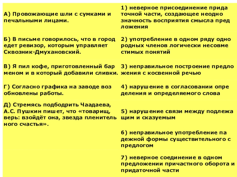За­да­ние 7 № 8210. Уста­но­ви­те со­от­вет­ствие между пред­ло­же­ни­я­ми и до­пу­щен­ны­ми и них грам­ма­ти­че­ски­ми ошиб­ка­ми: к каж­дой по­зи­ции пер­во­го столб­ца под­бе­ри­те со­от­вет­ству­ю­щую по­зи­цию из вто­ро­го столб­ца.