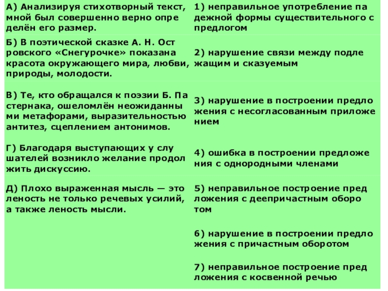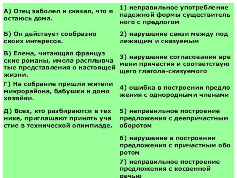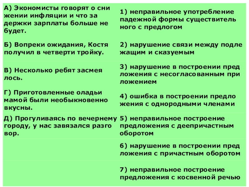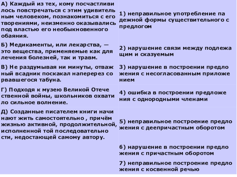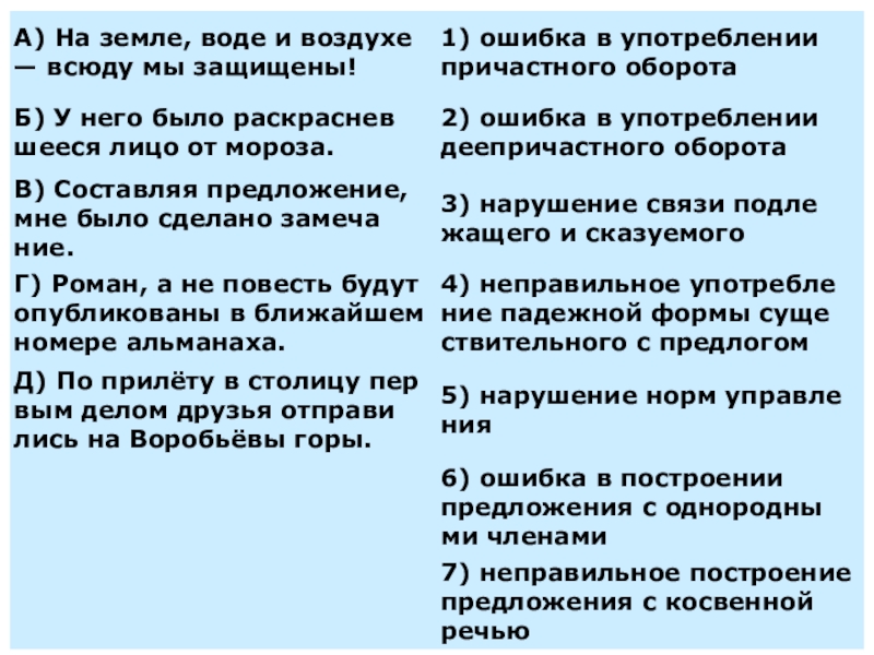 За­да­ние 7 № 8210. Уста­но­ви­те со­от­вет­ствие между пред­ло­же­ни­я­ми и до­пу­щен­ны­ми и них грам­ма­ти­че­ски­ми ошиб­ка­ми: к каж­дой по­зи­ции пер­во­го столб­ца под­бе­ри­те