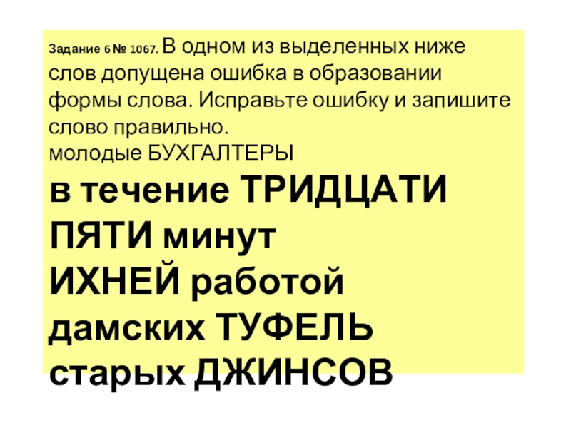 Слайд 28Задание 6 № 1067. В одном из выделенных ниже слов допущена ошибка в образовании