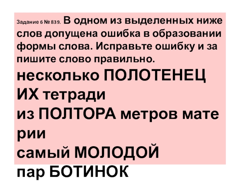 Слайд 40Задание 6 № 1827. В одном из выделенных ниже слов допущена ошибка в образовании