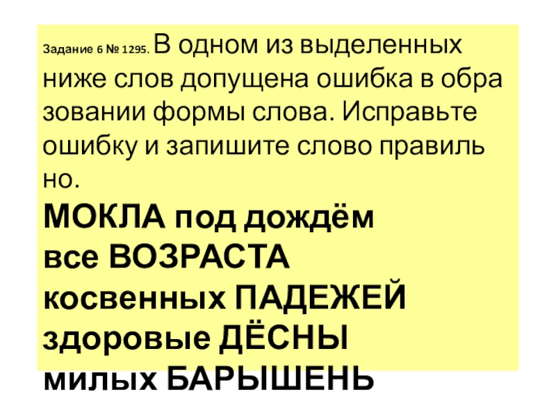 Слайд 34Задание 6 № 1295. В одном из выделенных ниже слов допущена ошибка в образовании