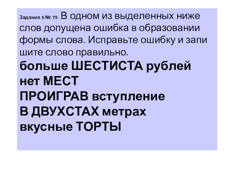Слайд 2Задание 6 № 79. В одном из выделенных ниже слов допущена ошибка в образовании