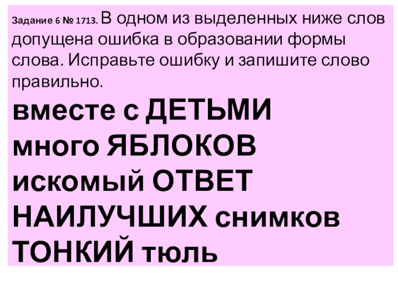 Слайд 37Задание 6 № 1713. В одном из выделенных ниже слов допущена ошибка в образовании