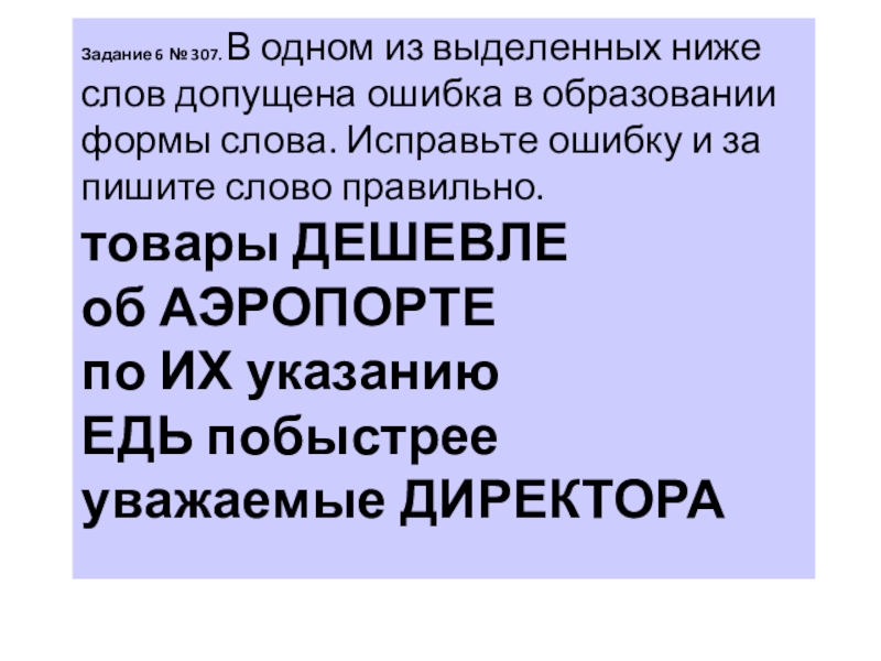 Слайд 8Задание 6 № 307. В одном из выделенных ниже слов допущена ошибка в образовании