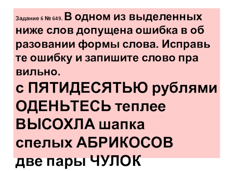 Слайд 17Задание 6 № 649. В одном из выделенных ниже слов допущена ошибка в образовании