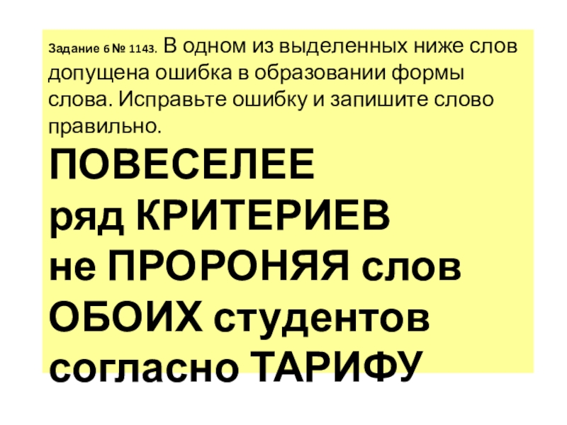 Слайд 30Задание 6 № 1143. В одном из выделенных ниже слов допущена ошибка в образовании