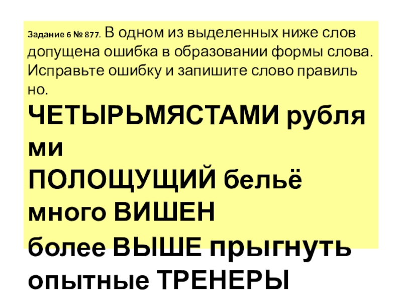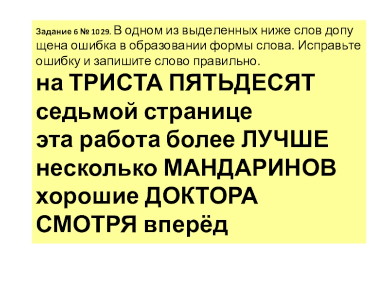 Слайд 27Задание 6 № 1029. В одном из выделенных ниже слов допущена ошибка в образовании